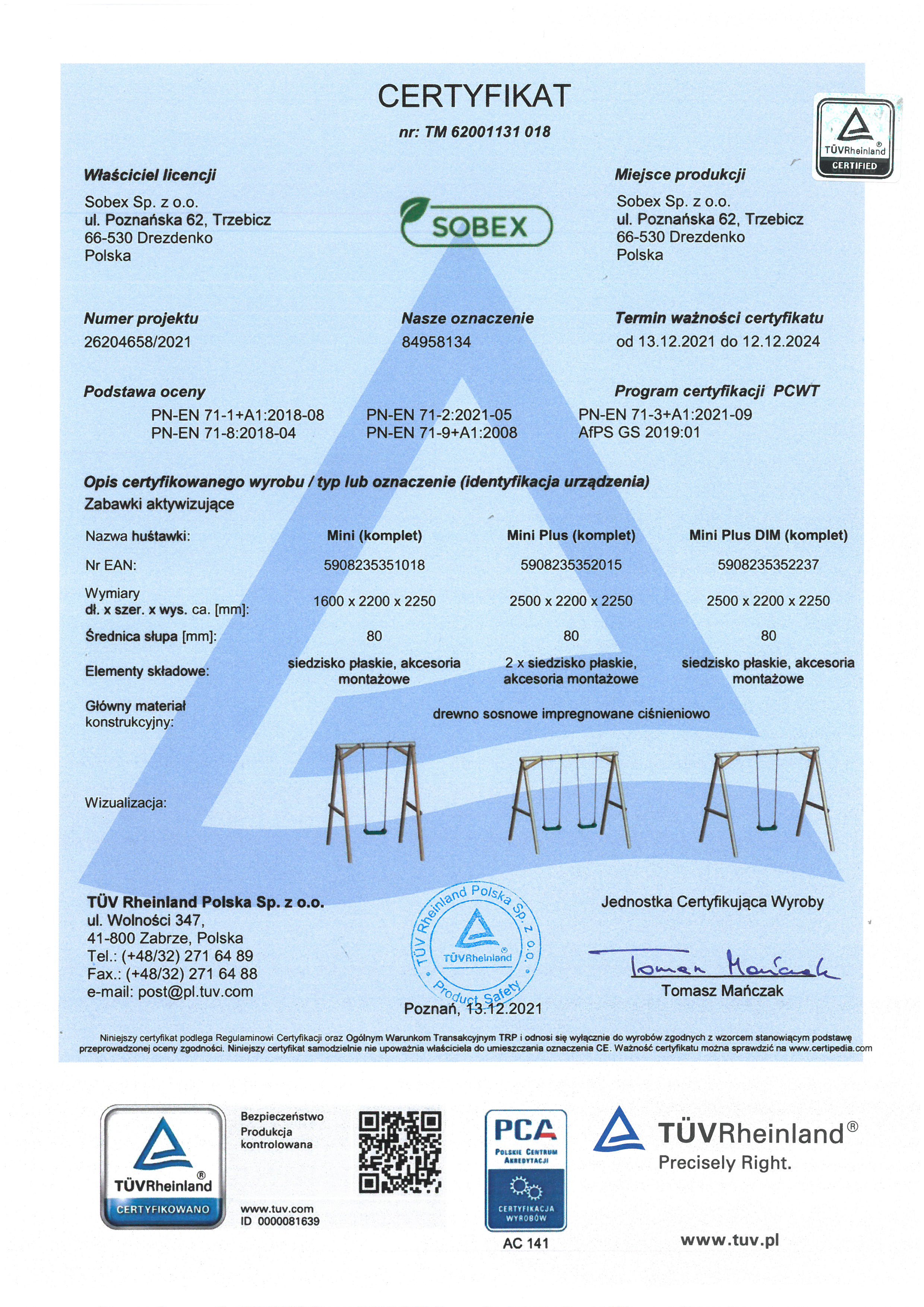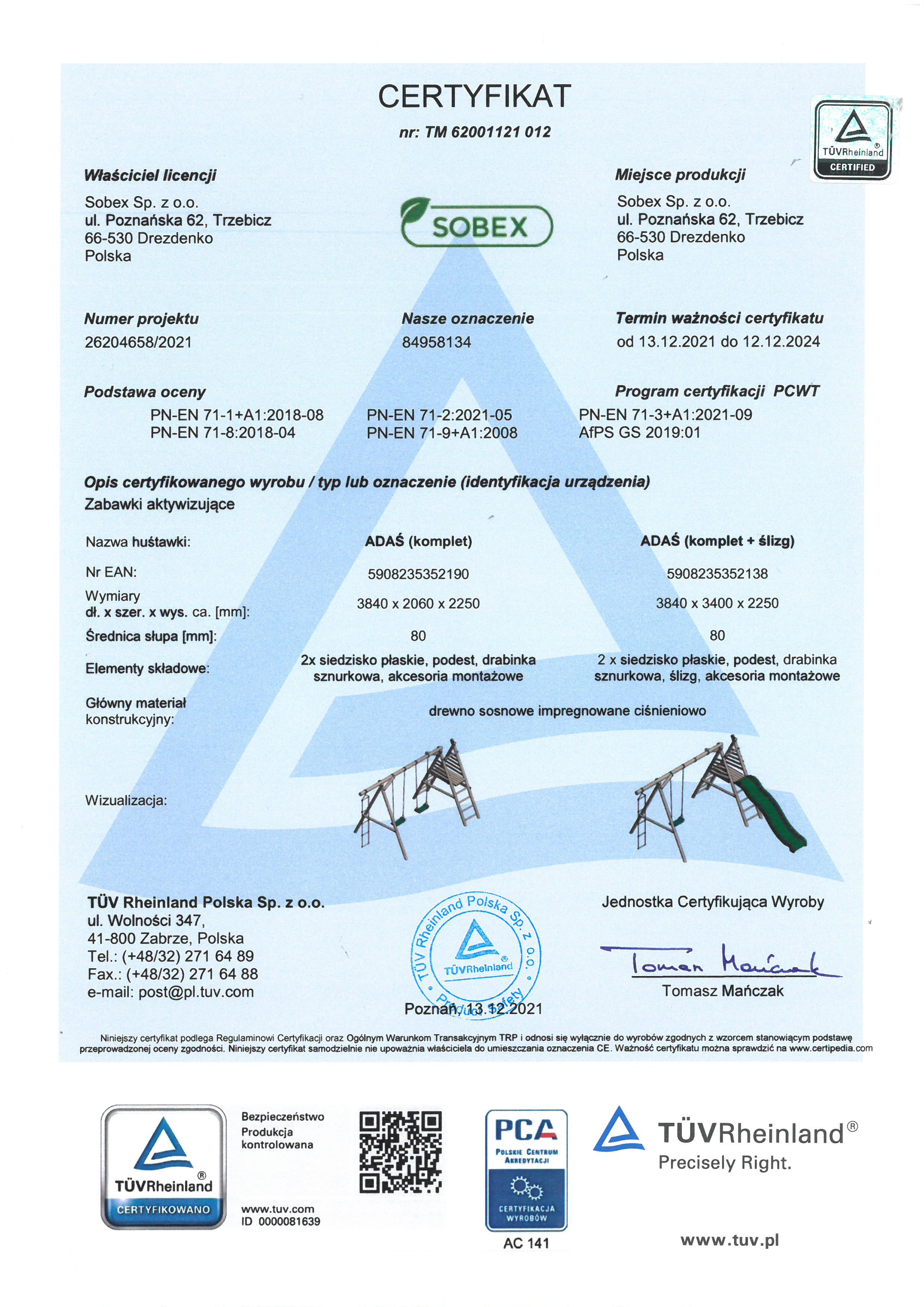 Certyfikat TUV HUŚTAWKI ADAŚ