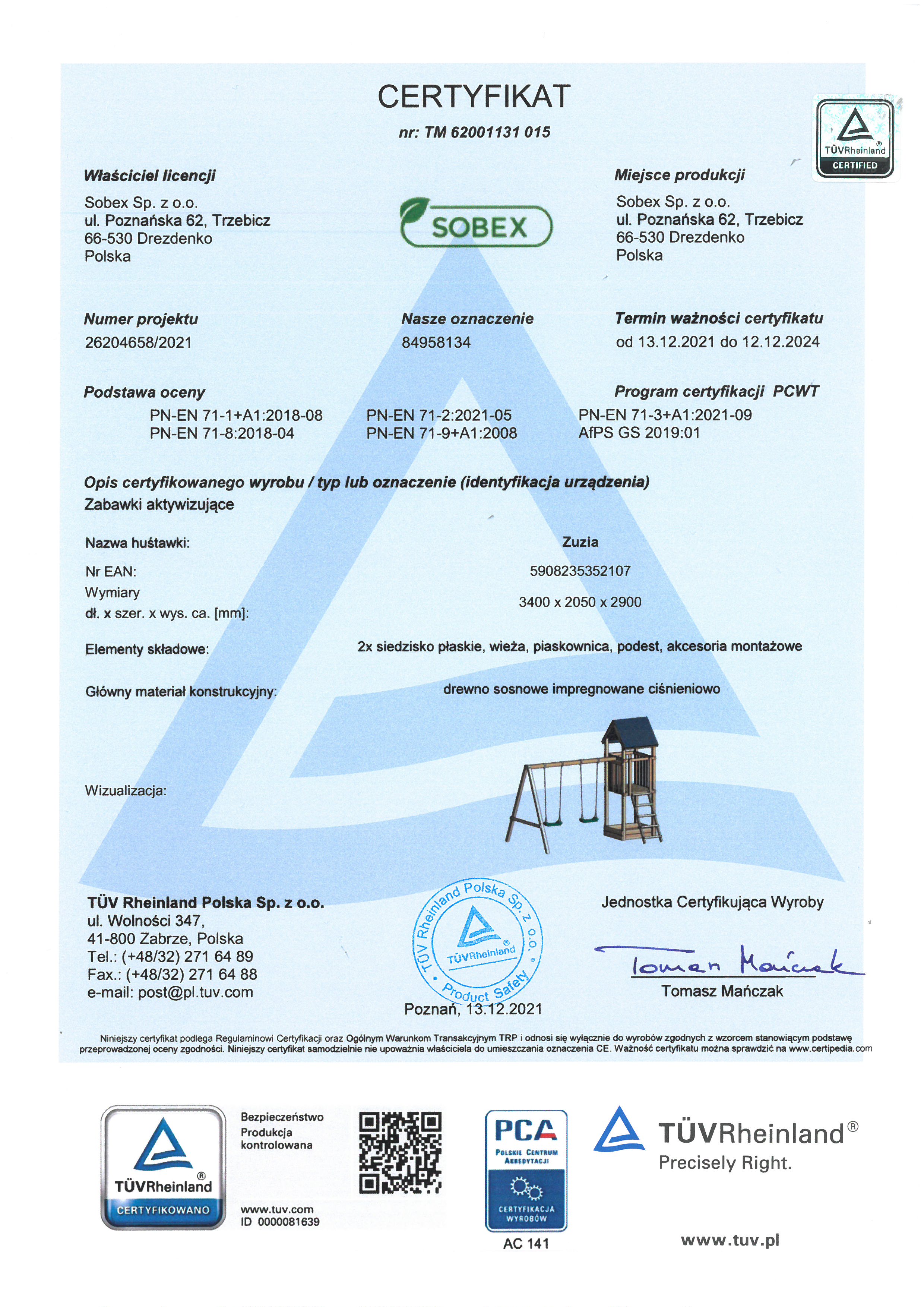CERTYFIKAT TUV HUŚTAWKA ZUZIA